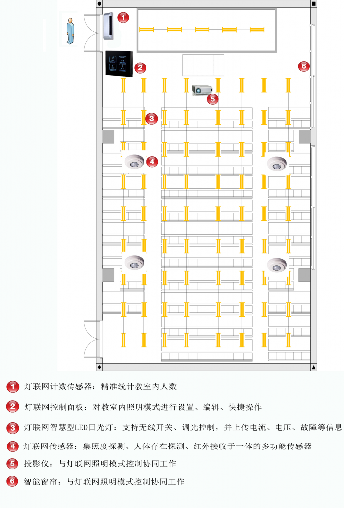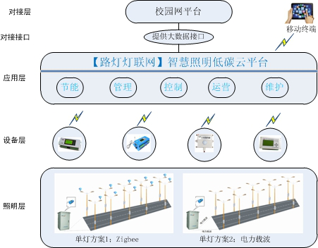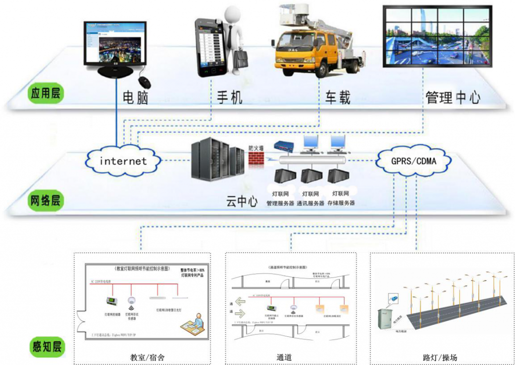 道路、教室、图书馆、办公室、食堂、宿舍、走廊公区等所有区域照明都在灯联网云平台统一管控。